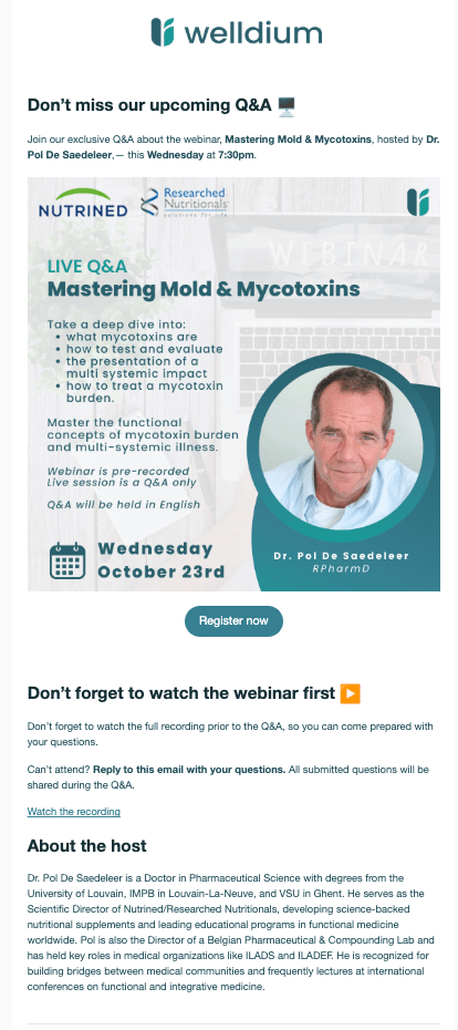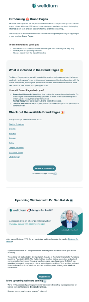 The brand needed ongoing newsletters and promotional emails for registered practitioners to keep members up to date with the platform, educate them on new and unfamiliar brands, and inform them about upcoming webinars.